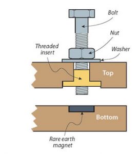 Cut the plywood or MDF to size. The boards must be flat and the ends must be parallel. Drill the holes as indicated in the templates on page 14. Glue rare earth magnets into the holes in the bottom board, and install threaded inserts into the under side of the top board. Make sure the boards sit flush against each other. Then, refer to the drawing and install the bolts, nuts, and washers from the top side of the top board. Do not tighten the nuts against the board. Finally, install the hinges across the ends opposite the other hardware. |