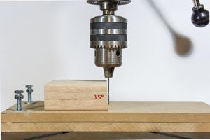 There are a couple of ways to set the angle of the board. For both methods, start with a closed jig and a horizontal (flat) drill table. Note: To drill at higher angles, you may need longer bolts.