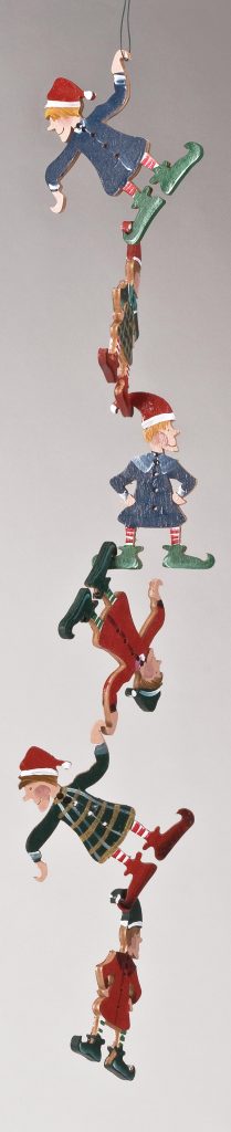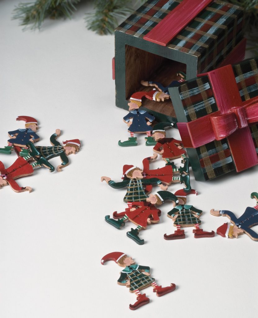 Step 1: Cut the elves. The patterns are aligned so you can fit both elf designs onto a 23/4″ x 4″ blank. Stack three 1/8″-thick blanks together and wrap masking tape around the stack. Create two of these stacks and attach the patterns with spray adhesive. Drill blade-entry holes for the frets and an additional blade-entry hole just outside the perimeter of each elf. Cut the frets first, then feed your blade up through the remaining hole to cut around the perimeter of the elves. This keeps your stack together longer and makes the cutting easier. Bevel the hands and feet with sandpaper to make it easier to hook the elves together.