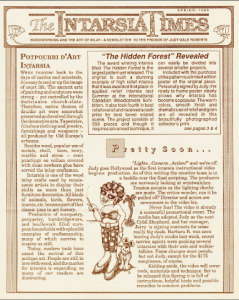A: When we first started in 1988, we relied on the mail. The first “Intarsia Times” newsletter was four pages that we folded and mailed; it had 15 patterns available. I still publish the “Intarsia Times,” although it is more of a catalog now, with so many patterns available. I think people enjoy having the newsletter in their hands to look at rather than relying on the internet. However the internet has made it much easier to keep up with everyone—Facebook, e-mails, and my website, intarsia.com, make sharing ideas much easier. I send e-mails about once a month with our “pattern of the month sale” and any other late breaking news about upcoming shows, classes, and intarsia-related news.