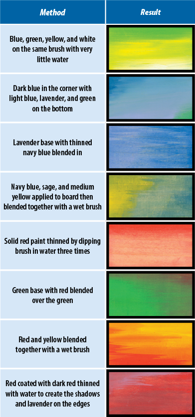 Acrylic paints and washes are easy to layer and blend. If you want to create a custom color, mix the paint prior to creating a wash, or use one of the methods below to create a specific result. Be sure to test the paint or technique on the same wood you plan to use in your project. Experiment with the mixtures and techniques. When you have one that works well for you, make sure to document the ingredients and their measurements so you will be able to duplicate it again in the future.