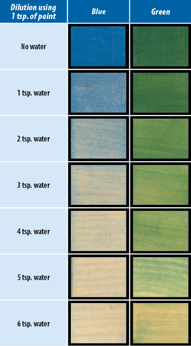 If you feel the wash is too light, apply subsequent coats or try a stronger wash. The following chart illustrates the variety you can achieve using different ratios of water with the same portion of paint.