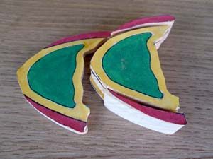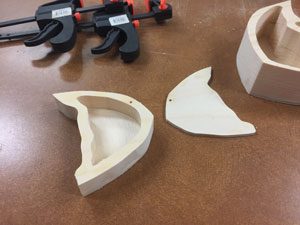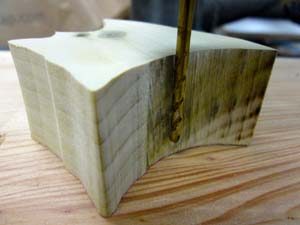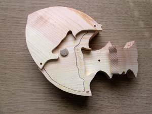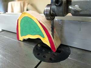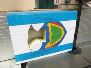 6: Cut 1/8″ (3mm) off the top of the inner fish section. Use the band saw. NOTE: Orient and cut this piece as indicated in the photo. Do not try to cut it with the curved surface on the band saw table. This piece will be the cover for the fish cavity that you just created. Set it aside. |