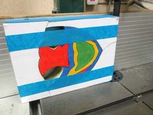 4: Use tape to secure the fish within the scrap perimeter pieces. Set the band saw fence to 1/4″ (6mm) and use the large band saw blade to rip 1/4″ (6mm) off the top of the fish for the lid. Set it aside. I make the lid 1/4″ (6mm) thick because a thinner lid is likely to warp. |