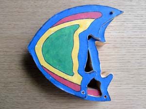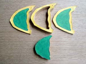 7: Attach another pattern to the remaining smaller fish. Cut off the two red fins with a scroll saw (Lines D and E). |