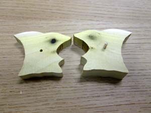 11: Cut the tail into two unequal pieces. Use the band saw. Make sure that the top tail that wasn’t drilled all the way through is the larger piece. Glue a 1/8” (3mm) diameter dowel into this larger piece leaving about 1/4” (6mm) exposed. Sand down the exposed tip of the dowel to a smaller diameter so that it fits easily into the bottom tail piece. This dowel protrusion is the key that will be used to open two of the puzzle box’s secret locks. Glue the smaller half of the tail to the box bottom. |