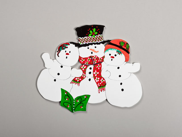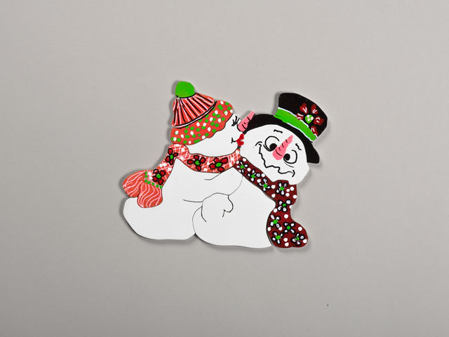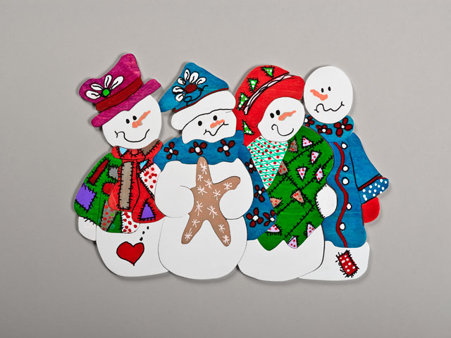When I made my first snowmen puzzle seven or eight years ago, I thought it was finished when I’d painted the snowmen white, added eyes and noses, and colored their clothing. My wife thought otherwise. She removed the puzzle from my hands and retreated to her workbench to embellish the snowmen with flowers on their caps and patches on their scarves. Since then, she has appointed herself art director, adding her artistic touch to our puzzles so each one is unique.