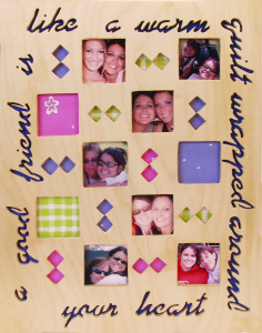Make a fun gift for a friend or special keepsake for yourself. This fretwork frame has a cozy message and spaces for 10 photos, accented with splashes of your school, team, or favorite colors.