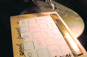 • Cutting words can tend to loosen the pattern. To keep everything in place, wrap the wood with packaging or painter’s tape and then use plenty of glue to attach the pattern to the tape. The pattern should stick to the tape, but the tape will be easy to peel off the wood.