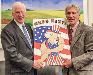 John presents U.S. Rep. Mike Thompson with his “Who’s Next?” Uncle Sam piece in Washington D.C. |
