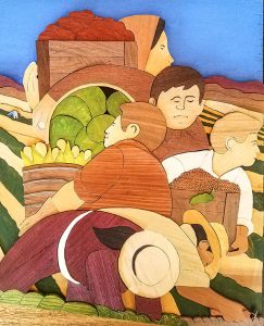 This piece, inspired by essential field workers, contains types of wood such as purpleheart. |
