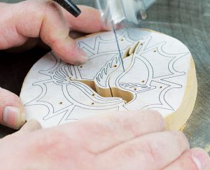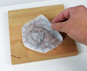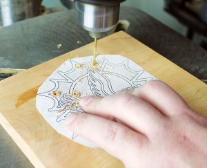 Getting StartedCoat the back of the pattern with spray adhesive, and then apply the pattern to the surface of the wood plank. I used cherry. Be generous with the amount of spray adhesive used. If there is not enough, the pattern will start to peel off as you cut. Once the spray adhesive dries, use a drill press to drill pilot holes 1/8″ (3mm) in diameter. |