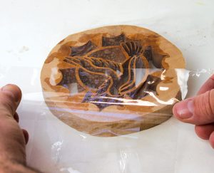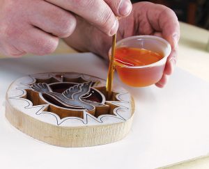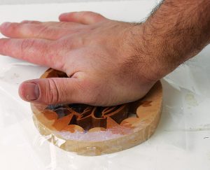 Materials • Wood blank, 3/4″ (1.9cm) thick: 6″ (15.2cm) square • Spray adhesive • Clear packaging tape • Resin, 4-6oz. • Transparent resin dyes • Sandpaper: various grits to 320 • Polyurethane • Clean cloth • Finish: clear spray laquer |