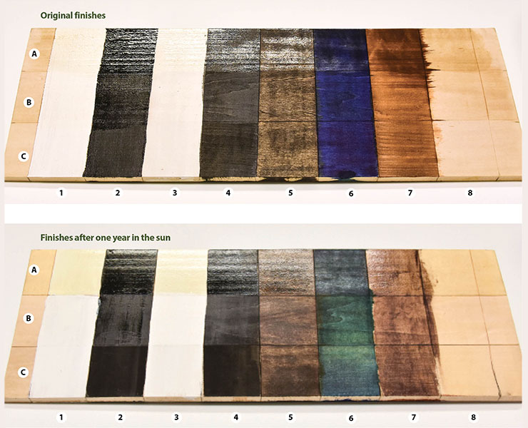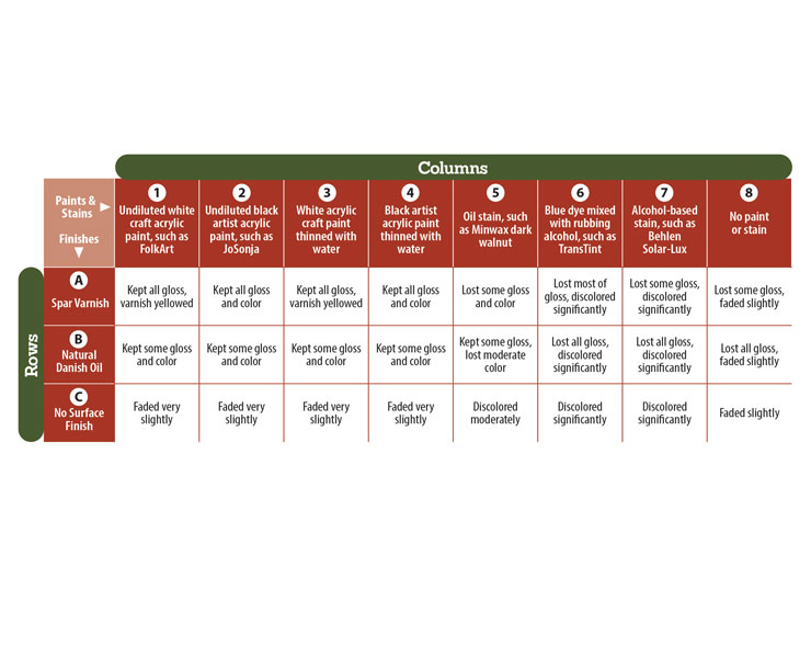The takeaway is obvious—any finish is better than no finish, but a finish containing UV blockers is ideal for projects you plan to keep outdoors. If you don’t want to apply a heavy finish like spar varnish, use paint or traditional oil stain; dyes and alcohol-based stains don’t stand up as well when exposed to UV rays.