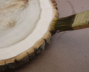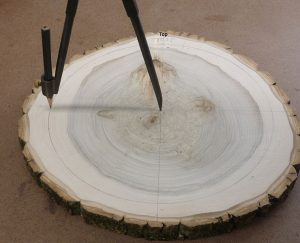 Getting StartedChoose a round between 5/8″ (1.6cm) to 3/4″ (1.9cm) thick, and 8″ (20.3cm) to 11″ (27.9cm) in diameter. Stabilize the bark by elevating the round and applying shellac gently but thoroughly to the rough outer surface. Use cyanoacrylate (CA) glue to reattach any pieces of bark that break loose. Sand both sides of the round progressively through the grits to 320 with an orbital sander. |