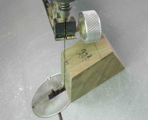 Cut the first circle. Mark a drilling point with an awl where the cutting line intersects one of the registration lines. Use a shop-made angle guide (see Tip below) and a #56 drill bit to drill a blade-entry hole, drilling directly toward the center of the blank. Note: The drilling angle depends upon the wood thickness: use 31˚ for wood 3/4″ (1.9cm) thick; use 33˚ for wood 11/16″ (1.7cm) thick; and use 35˚ for wood 5/8″ (1.6cm) thick. Tilt the left side of the saw table down to the same angle. Use a #7 blade to cut clockwise around the circle to complete the first ring. Mark the top of the blank to correspond to the top mark on the ring, placing it about 1″ (2.5cm) from the edge. This piece is the base. |