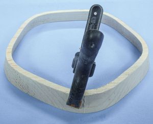 Cut the pieces. To reduce the amount of sanding, you will want to set the table angle as exactly as possible; for a 3/4″ (1.9cm)-thick piece, set the angle to 19°. If you prefer the pilot hole method to the ring-cutting method (click here), drill a pilot hole on each ring line using a drill or rotary tool and a #56 wire size bit. Then cut the rings and base on a scroll saw.