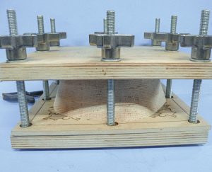 Assemble the bowl. Start with the top ring, face down, and add a bead of wood glue, spreading it thinly along the gluing edge. Add the second ring and press down the assembly with a heavy book, or in a bowl press. When dry, add the third ring and follow the same method; adding the rings one by one decreases the likelihood that they will slide and become misaligned. Do not add the bottom yet.