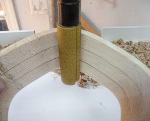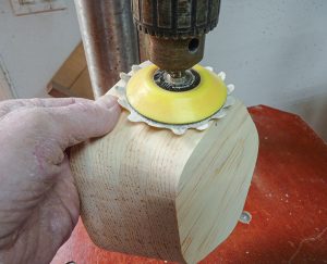 Sand the interior. I used a sleeveless drum sander and regular sandpaper sheets rather than sleeves. Sand to 220-grit. Wipe off dust with a tack cloth, and then glue on the bottom of the bowl. Weight it down and check for squeeze-out. Let dry.