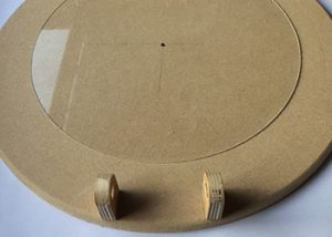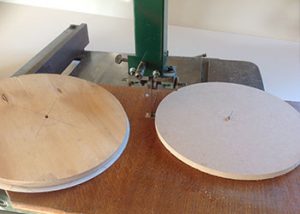 1: Cut the perimeter of the base and frame. I use a band saw with a simple circle cutting jig, but it can be cut with a scroll saw. Then, drill a blade-entry hole and cut the inside of the frame. Use the inner dotted line on the frame pattern to cut the clear acrylic plastic for the window. Leave the protective film on the acrylic plastic until the final assembly.