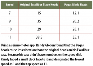 In addition, Randy used a seismometer app to examine the differences in vibration between his original Excalibur blade clamps and the Pegas blade clamps at various speeds. “I spent hours testing this, and the vibration was measurably less with the Pegas clamps,” he said. Data aside, however, Randy admitted that he didn’t notice much of a difference in vibration when he was focusing on a project.