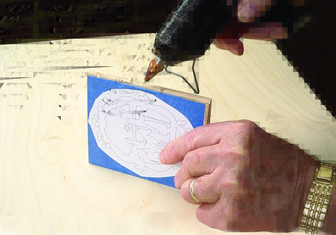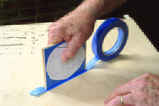 Temporary-bond spray adhesive is the most common method used to attach patterns to stock. Cover the wood blank with blue painter’s tape to lubricate the blade and make the pattern easier to remove. Photocopy the pattern. Spray the adhesive on the back of the copy of the pattern, wait a few seconds, and then press the pattern onto the taped blank. Rubber cement or glue sticks work similarly.