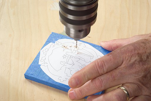 Some patterns have blade-entry holes marked. If the pattern doesn’t, place the holes near a line to be cut to prolong the blade life, but don’t place the hole on a curving line or inside corner (if possible). Drill the hole perpendicular to the blank. Use a drill press if you have one; otherwise, use a hand drill and make the holes as vertical as possible. Drill through the blank into scrap wood to prevent tear out on the back side of the blank. If you have the space, use a larger bit—it will make it easier to thread the blades through. For thin veining cuts, use the smallest bit the blade will fit through.