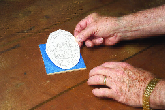 Some scrollers prefer to use clear adhesive shelf paper. Place a piece onto the table, shiny side up. Cut the pattern pieces apart if necessary, apply spray adhesive to the back, and attach the patterns to the shelf paper. Cut the pattern pieces out. To apply them to the blanks, peel the liner off the back of the shelf paper.