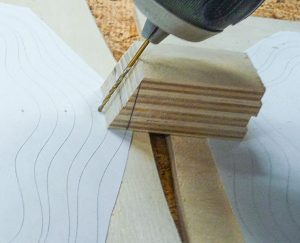 Copy the patterns and transfer them to the plywood; I used graphite paper and a pencil, but you can attach them with repositionable spray adhesive. Prepare a drill angle guide and a blade angle block to make angled cuts on the scroll saw.