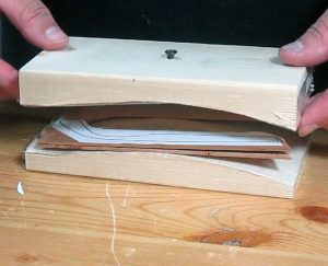 Step 8: Carefully position the top of the form on the stack. Make sure the screw is lined up with the screw hole in the bottom of the form. Screw it down slowly to bend the frames into shape, making sure the frame pieces do not slip out of place. This step requires patience. Secure the form with clamps. |