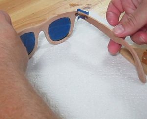 Step 14: Use hinges to attach the temples to the front frames. I use epoxy to attach spring hinges cut from metal reading glasses, or you can use any eyeglass hinges. Make sure the temples are in the correct position and the sunglasses lay flat on the table during glue up. Do not glue the hinges shut. Apply mineral oil or a beeswax finish; some other finishes can irritate the skin. |
