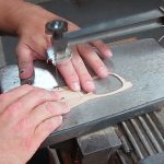 Step 4: Secure the two remaining frame blanks together. Trace the lenses onto the pattern, and then draw another line about 1/8″ (3mm) inside that line. The openings in the front and back frame pieces need to be smaller to hold the lenses in place. Cut the openings and sand them smooth. |