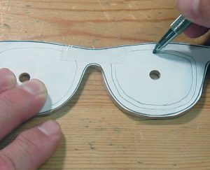Step 3: Trace the lenses onto the middle layer. Drill blade-entry holes and cut the lens openings. The lenses should fit inside the openings with a little wiggle room around them. |