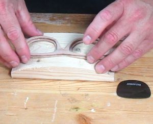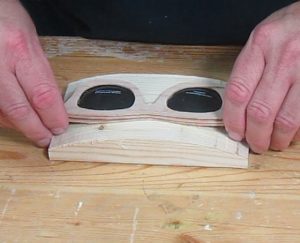 Step 5: Trace the arc from an old pair of sunglasses onto a piece of 2×4. Cut the 2×4 along this line. Drive a long screw through the 2×4 below where you expect the nosepieces to be, and then remove the screw. Cover the inside of the form with packaging tape so the form will not stick to the frames. |