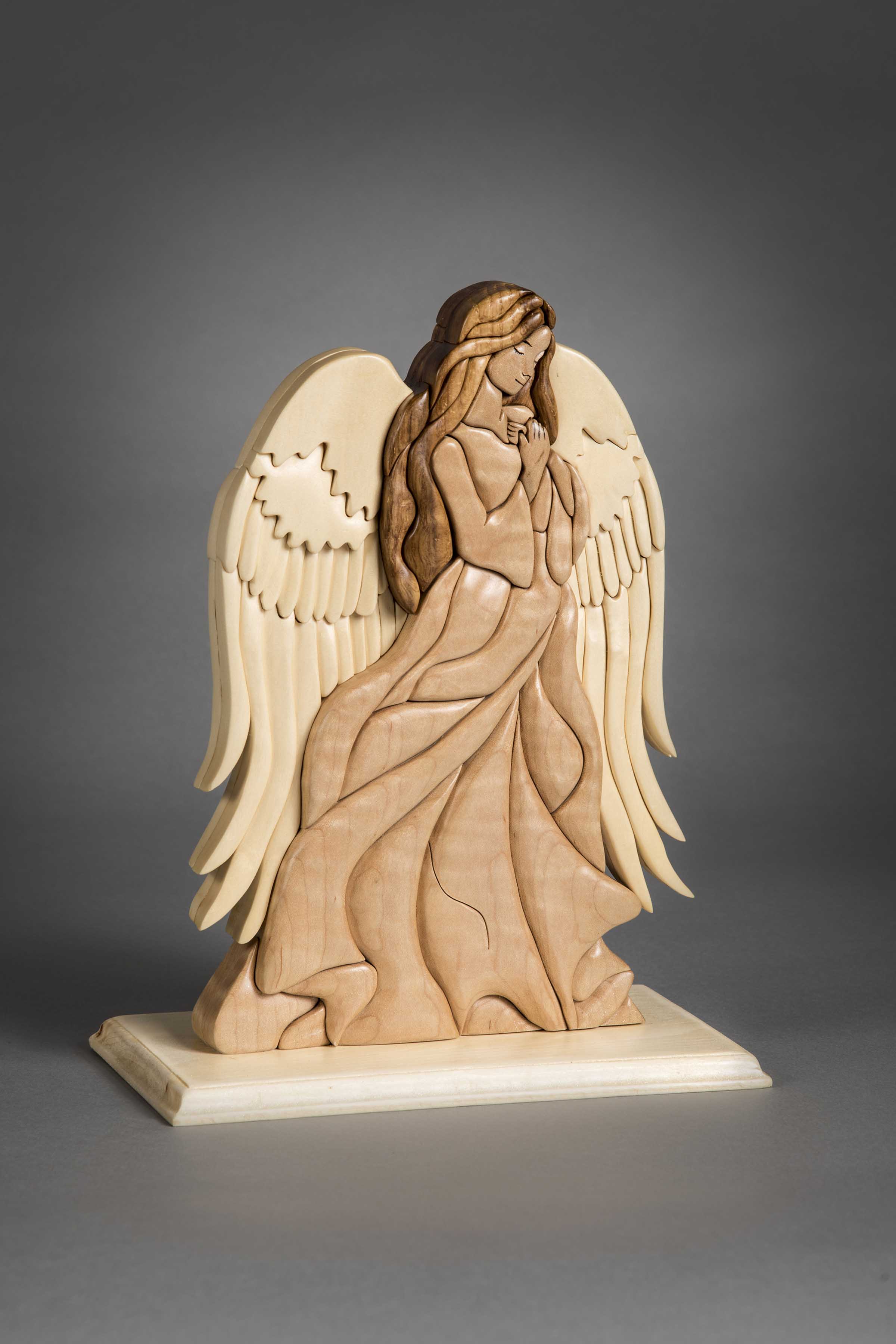 Scrollers were well represented in the show’s competition as well. Curt Blosser took home both First Place and Best of Scroll Saw Category for his chess set, made using a pattern by Dan Wilckens that appeared in Scroll Saw Woodworking & Crafts Fall 2017 (Issue 68). Bruce Shea won Second Best of Category with a red, white, and blue scrolled bowl. Erick Ortiz won the Deitz Religious Award for his cubist depiction of Jesus, as well as Third Best of Woodworking for his eagle head portrait. Vickie Schaub was a winner as well, taking a prize for her angel intarsia, made using a pattern by Kathy Wise that appeared in Scroll Saw Woodworking & Crafts Holiday 2015 (Issue 61).