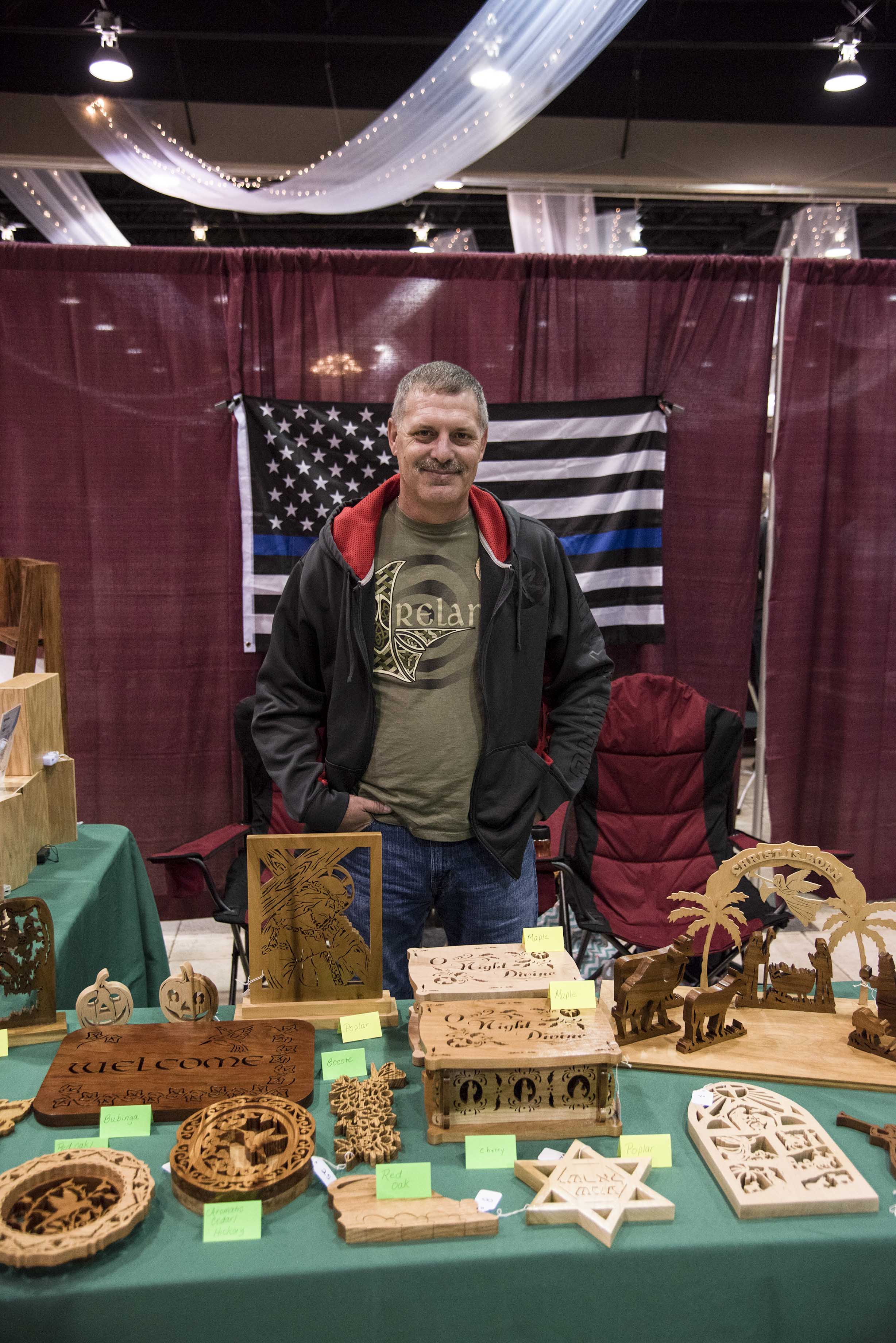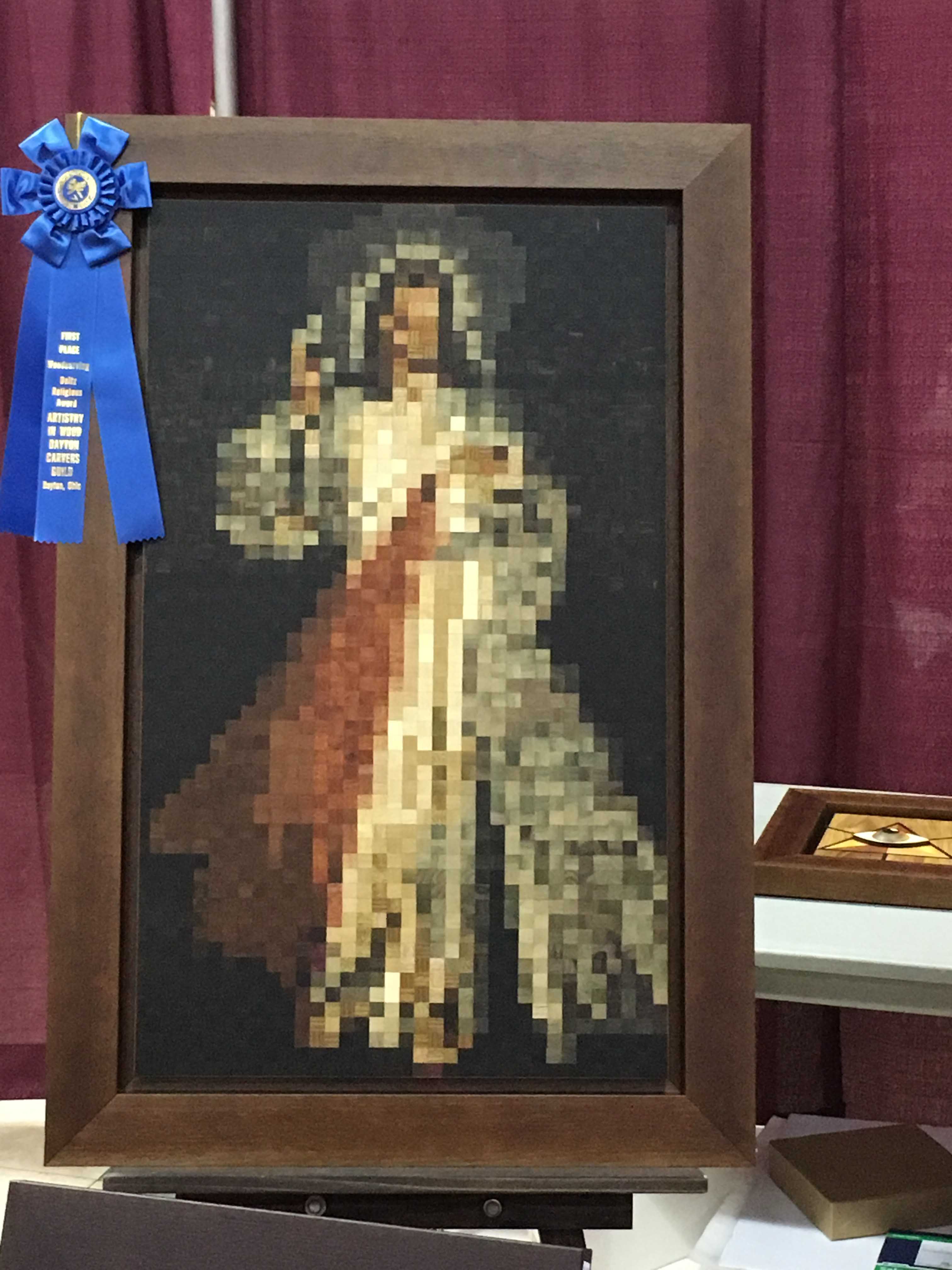 Newcomer Erick Ortiz flew in from hurricane-ravaged Puerto Rico to exhibit at the show. He won the Deitz Religious Award for his cubist depiction of Jesus, as well as Third Best of Woodworking for his eagle head portrait.