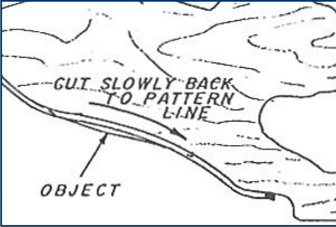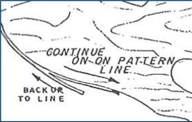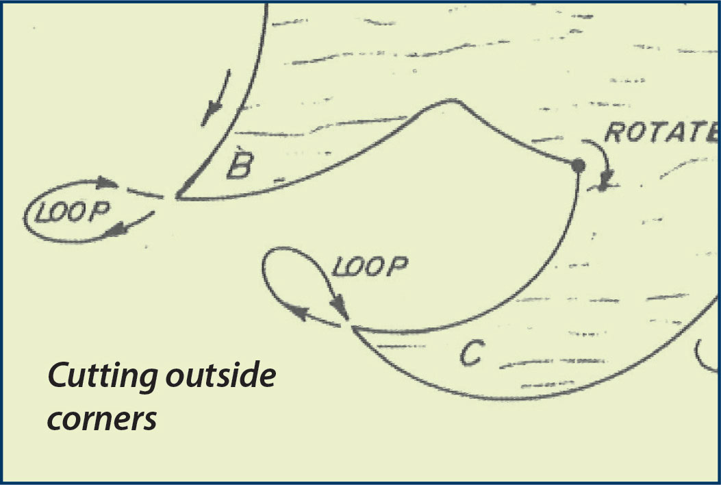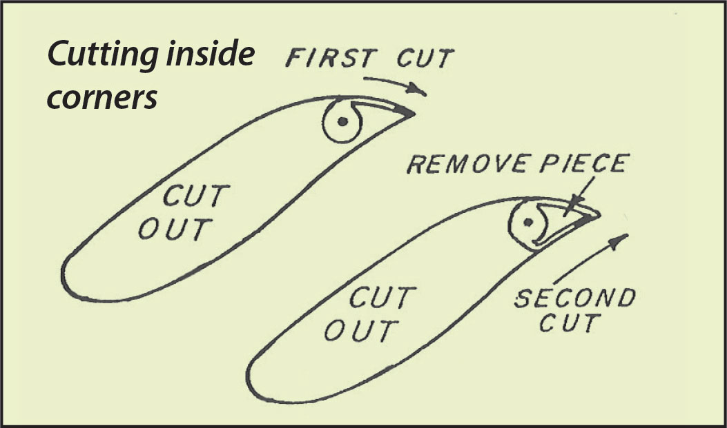 • Cutting away from the line into the waste: Back the blade to the place where it left the line and continue forward on the line.