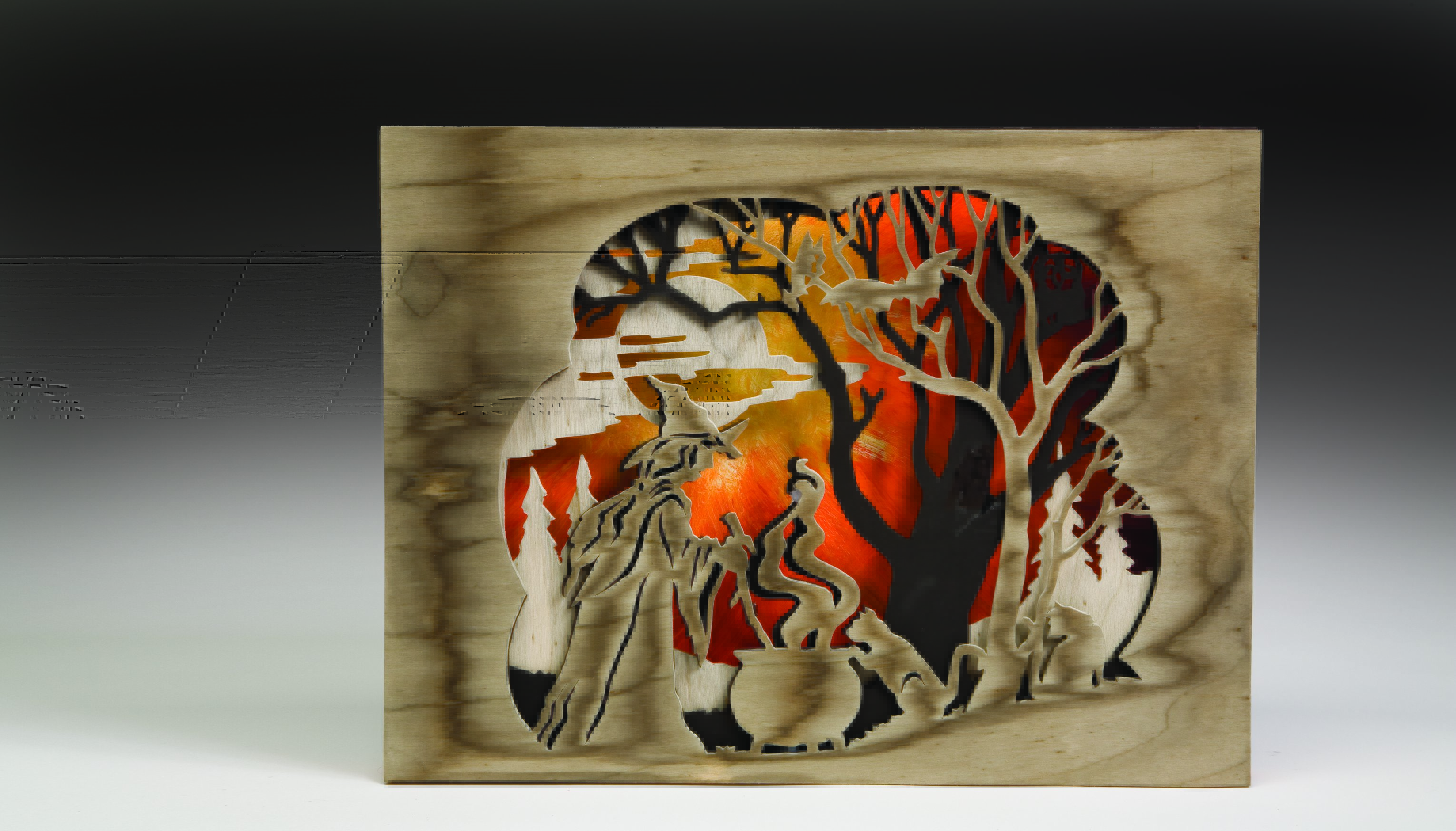 This pattern departs from Jacob’s usual animal designs, but it is cute and fun to cut. I used a piece of light-colored box elder wood for the fretwork, and a piece of ash for the optional backing board.