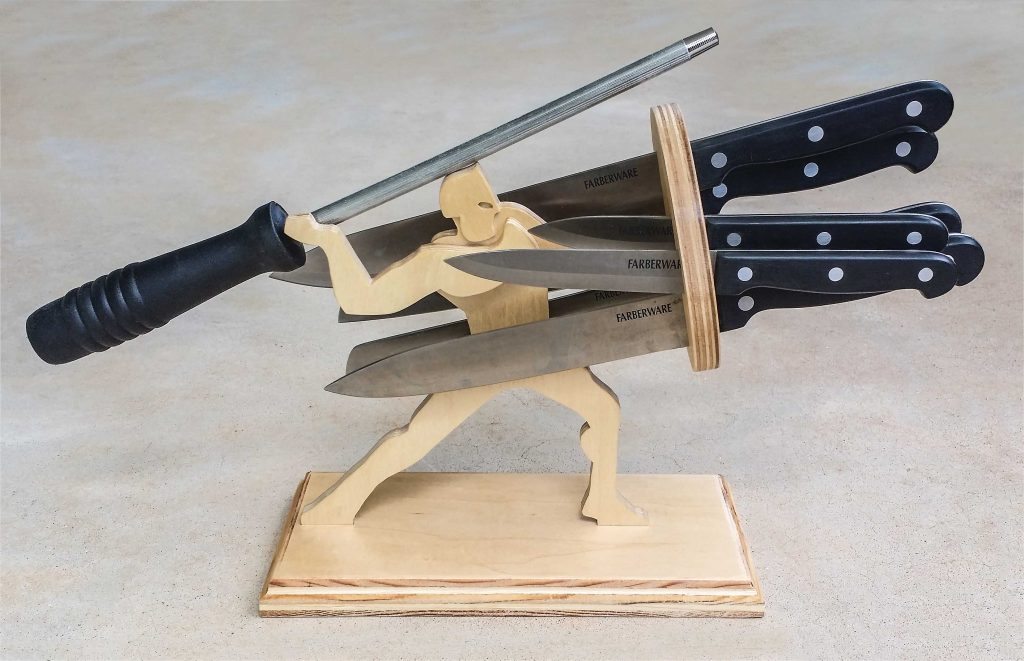 Cody Blevins of Aliso Viejo, Calif., was inspired by the movie 300 to create this knife stand. The stand is 6″ by 8″ by 10″ and was made from birch plywood. It was finished with Bulls Eye shellac and can hold up to eight knives.