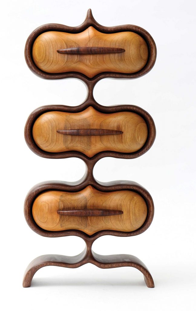 Thomas Haapapuro of Charlotte, N.C., created this box as part of a series he created for his book Fresh Designs for Woodworking. The concept was to create unique, organic boxes for the home and office using a scroll saw and power carving tools. This particular box riffs on forms and shapes popular in the mod period of design from the ‘40s and ‘50s. The form is repeated vertically to give a striking visual interest, as the box appears to grow from the base much like a blooming plant.
