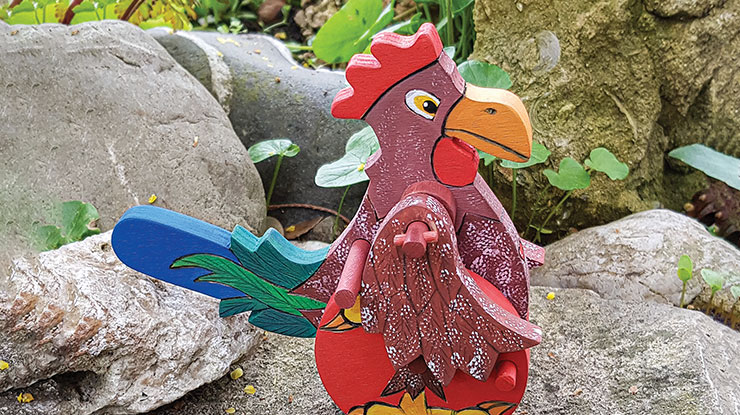 While cleaning a friend’s house one day, I discovered a funny chicken toy. I thought it would be the perfect gift for a friend’s daughter, so I recreated the toy and made it a rooster. My friend’s daughter was very happy about it. I wish you just as much joy with your wheely rooster.