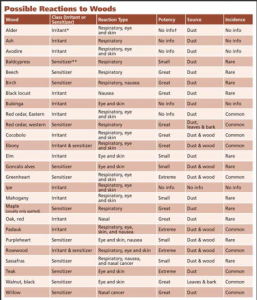 These defences, usually in the form of an irritant or toxin, carry over to the lumber used in woodworking projects. Not every person responds to these woods the same way, but the attached chart highlights some woods that you might consider taking more precautions with.