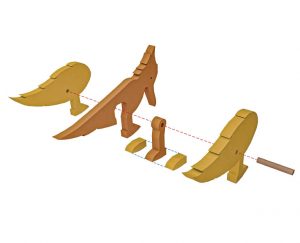 Cutting and AssemblingCut the pieces. Then drill the 1/4″ (6mm)-dia. dowel holes while the outer pieces are stacked. Use an awl to mark the center of the swinging leg piece. Remove the patterns and sand each piece with an orbital sander, lightly softening the sharp edges on all sides except the ones that will be glued; these should stay flat. Take extra care to smooth the swinging leg piece, as it should be able to move without friction. Drill a 17/64″ (7mm)-dia. hole through the awl mark on the swinging leg piece. Stack the three body pieces, making sure the edges are flush. Glue and clamp one side onto the central body piece, keeping glue out of the area where the swinging leg will go. Once the glue is cured, dry-fit the rest of pieces together with clamps. You can dry-fit a dowel into the hole to help with alignment. By clamping the two sides during the dry fit, you simulate the conditions of the actual glue-up, and can easily sand the swinging leg further if it binds when pressure is applied. The legs will form a slight curvature when side-by-side to allow for rocking. Note: If the legs do not sit at the same level, the bird will not walk properly. Refer to the exploded drawing below. |