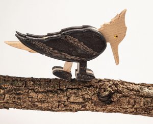 In addition to their striking features, woodpeckers are notorious for, well, pecking wood. They use their long beaks to peck, drill, and drum wood for hours, relying on their strong tail feathers to support them as they cling to a tree trunk or branch. They also have two back toes to lean on! My woodpecker ramp walker does not have helpful toes, but it does have movable legs that will get it from point A to point B. All this dynamic toy needs is gravity to get moving.